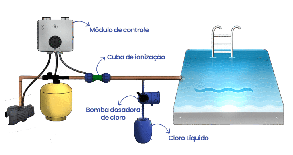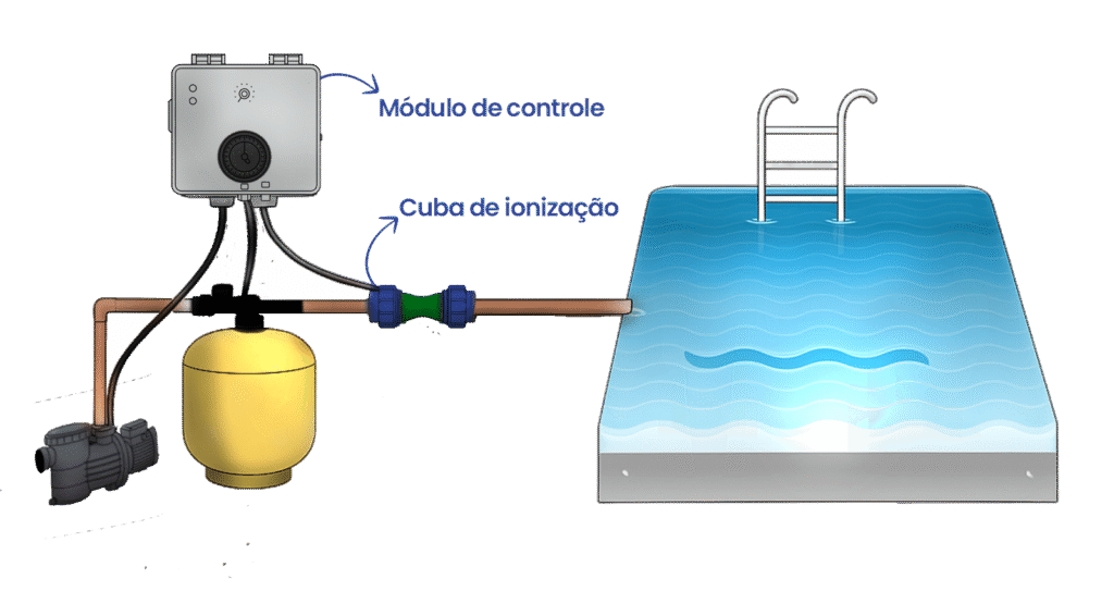 O ionizador gera íons de cobre que é a sua base de funcionamento para a proteção contra a proliferação de algicidas.