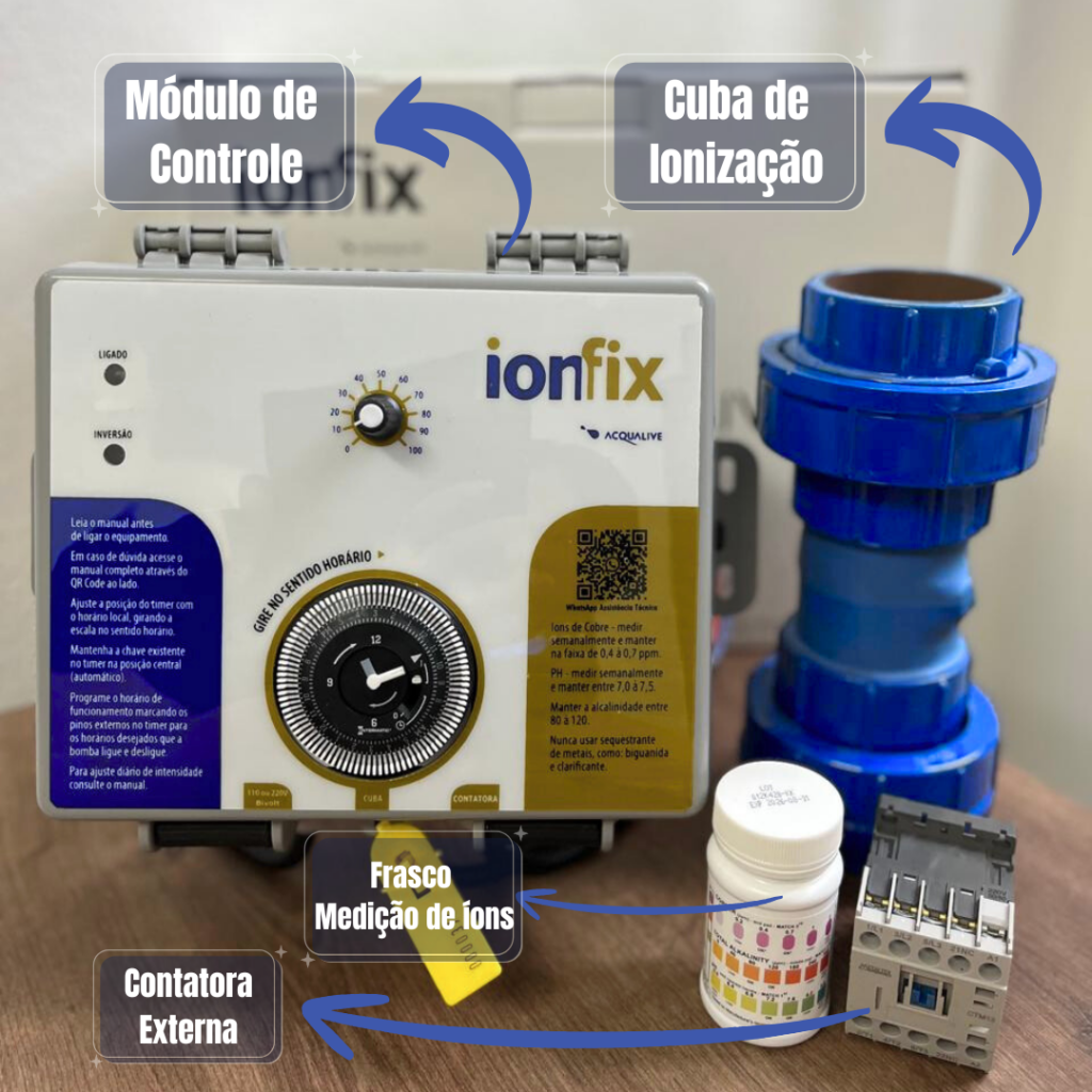 Não. O Ionfix libera íons de cobre para proteção residual da água, enquanto um ozonizador gera ozônio que trata a água apenas enquanto ela passa pelo equipamento. A ionização mantém a água livre de contaminantes por mais tempo, mesmo com a bomba desligada.
